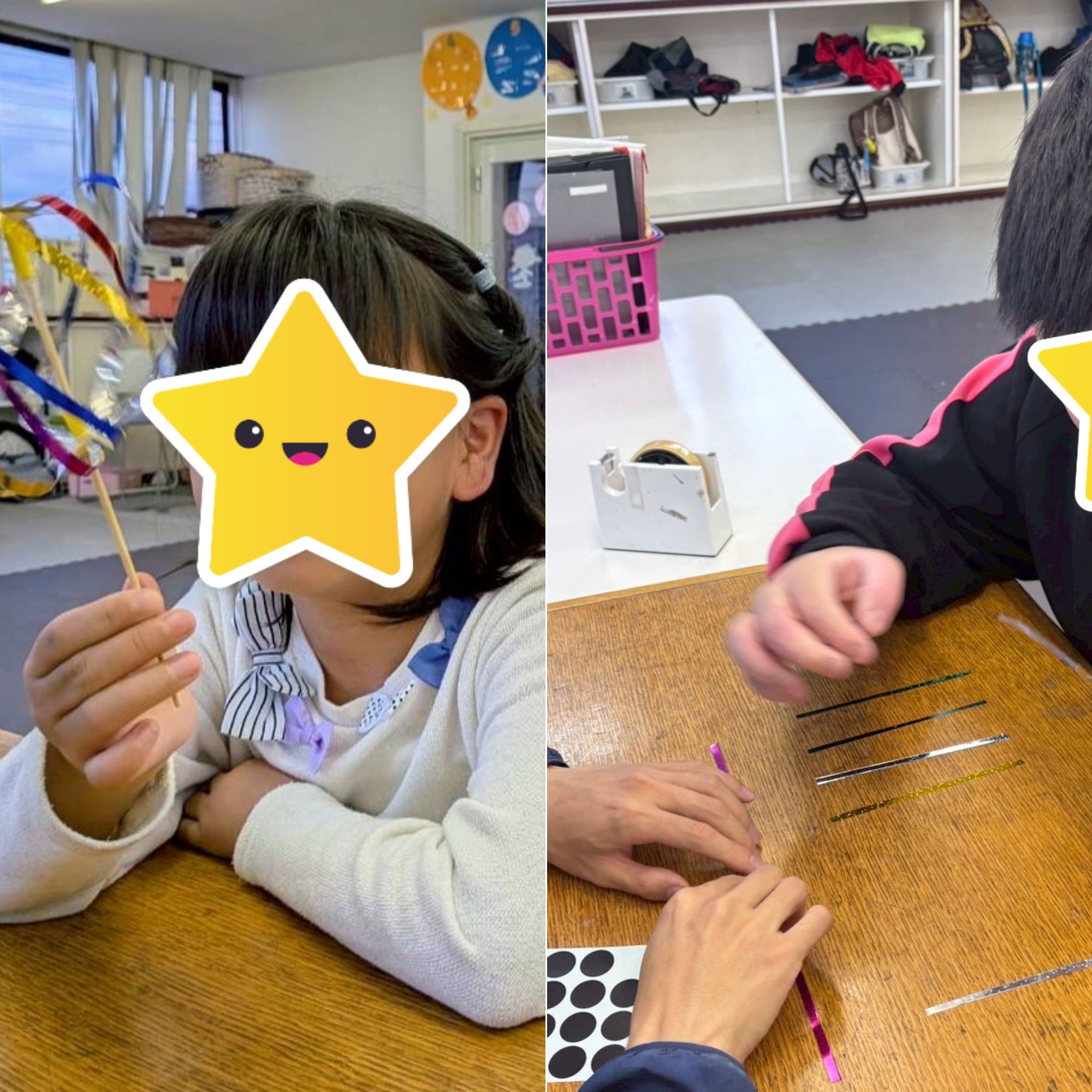 くるくるシャボン玉づくり 11月18日はくるくるシャボン玉を作りました。 見本を見せて回すと、作りたいという子がたくさん出てきました。 細かいパーツをみんな上手に張り付け、完成させました。 自分で作った物を回すととてもきれいで、感動していました。