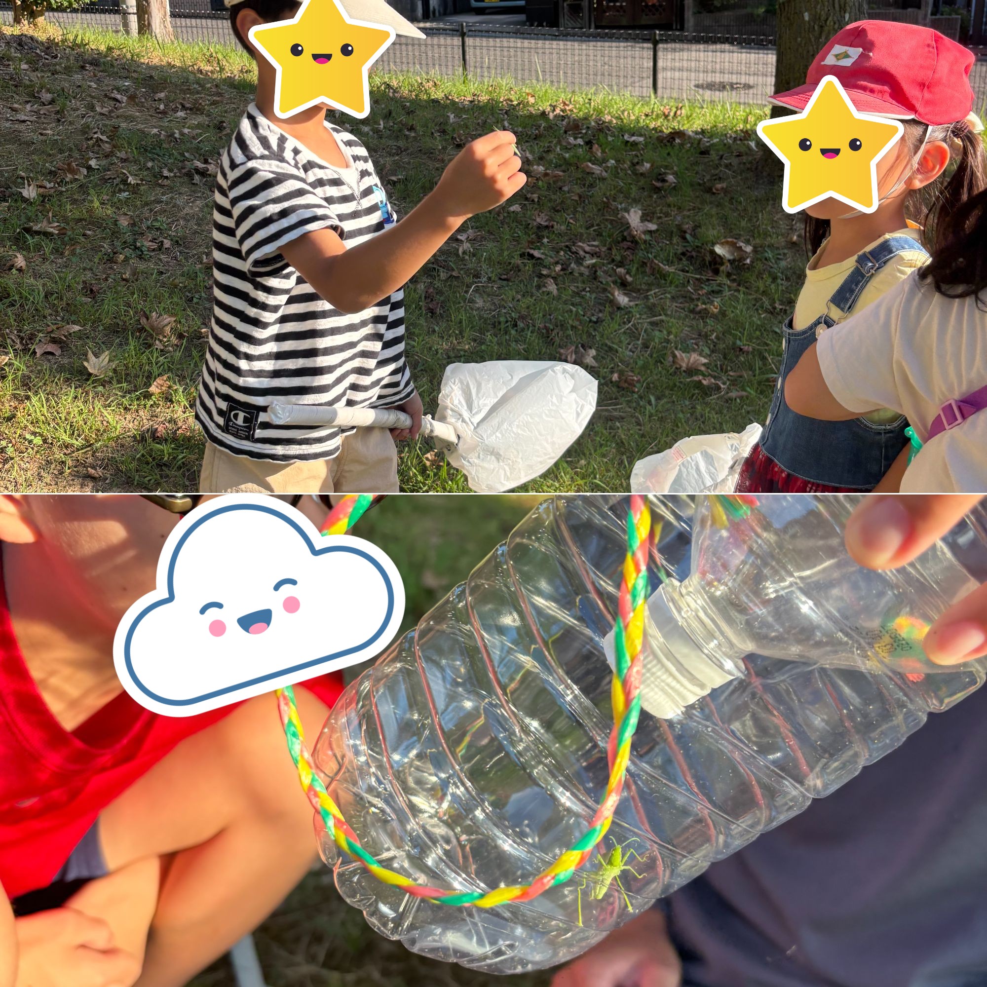 スタッフ自作の虫取り網と虫かごを持って裏の公園へGO!