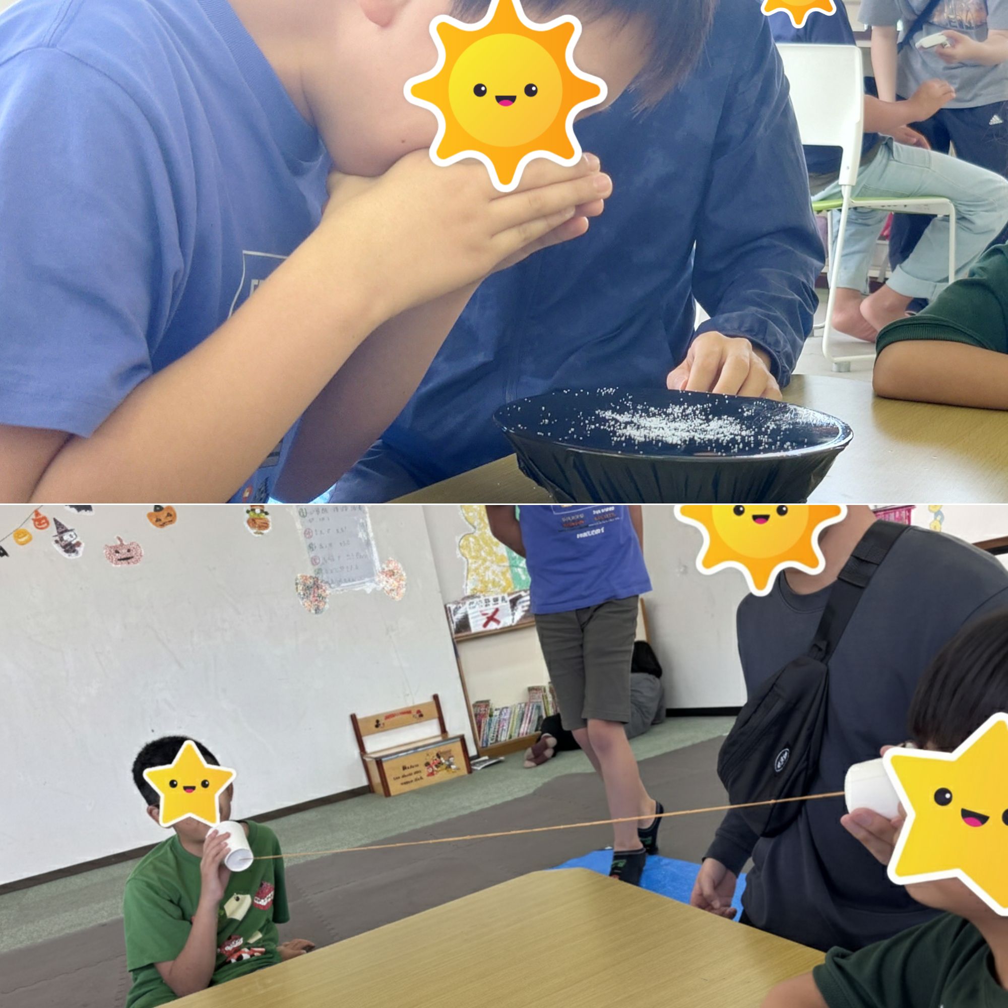 実験 音の振動 10/18は実験で音は振動するのかの実験をしました。 ボールにゴミ袋を貼ってそこに塩を振りまいて、そこの声を当てるようにだすと、なんと塩が震えました。これには子どもたちもびっくり! 次に糸電話の実験では紙コップにいろんな素材でつなげて実験してみました。 糸や銅線やゴムなどの素材を使って実験し、どれが聞こえやすかったかなと試してみました! ひとつだけ、驚くような聞こえやすさのものがありました。