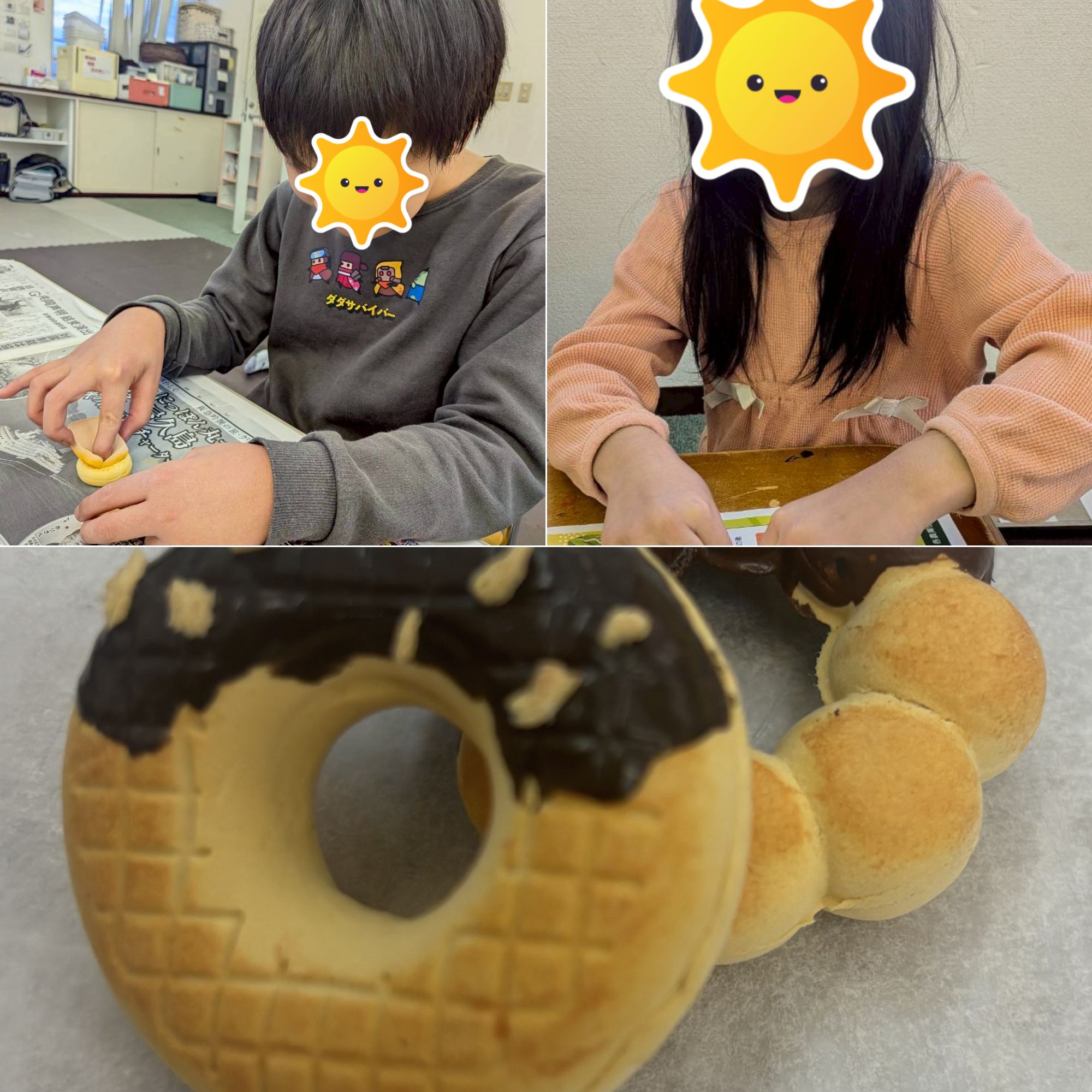 模造ドーナツ 11月17日は模造ドーナツづくりをしました。 ドーナツの粘土にスポンジで絵具を付けて、こげのようにしてリアルに仕上げました。 あとは、お好みでチョコレートを付けたりして作りました。 抹茶やストロベリーを付けている子もいましたが、チョコミントを作ってほしいという、珍しい子までいました(笑)